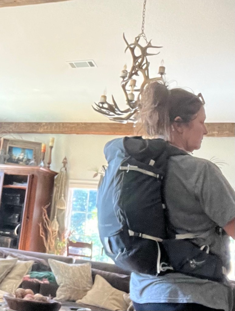 I packed the 20L Osprey backpack today and wore it around the house, on a little jaunt through the orchard, then adjusted the shoulder straps and decided I could absolutely hike 26.4 km a day in this Tempest model featuring a breathable back. Time will tell.